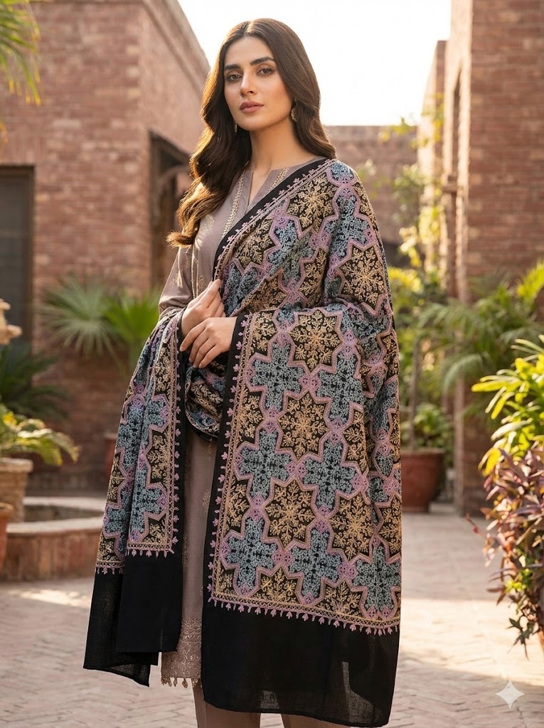 IslamPur Swati Shawl – Black – Yellow and Pink Work